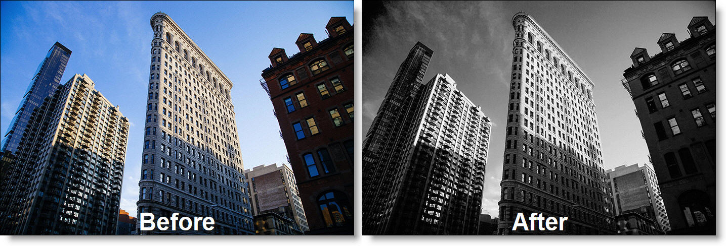 Black and White converts color images to black and white simulating the look of Black and White photographic filters.