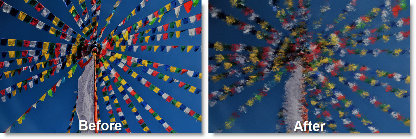 Simulates the look of an oil painting or a chalk drawing by layering brush strokes of different sizes and directions. This effect can be used with one of the following brushes: felt tip, splat, water color, stipple, pencil, pastel, sponge, splodge, round, or cubes.