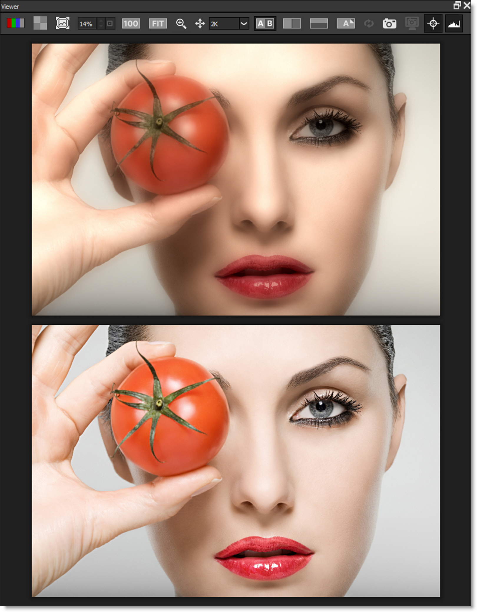 5 Enable the A/B Comparison icon and then click the Show Other View icon that appears to cycle the current filter with the original image.