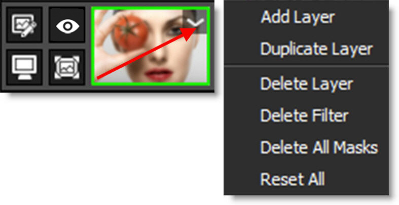 Click on the layer’s image thumbnail context menu to choose from a list of layer and mask actions.